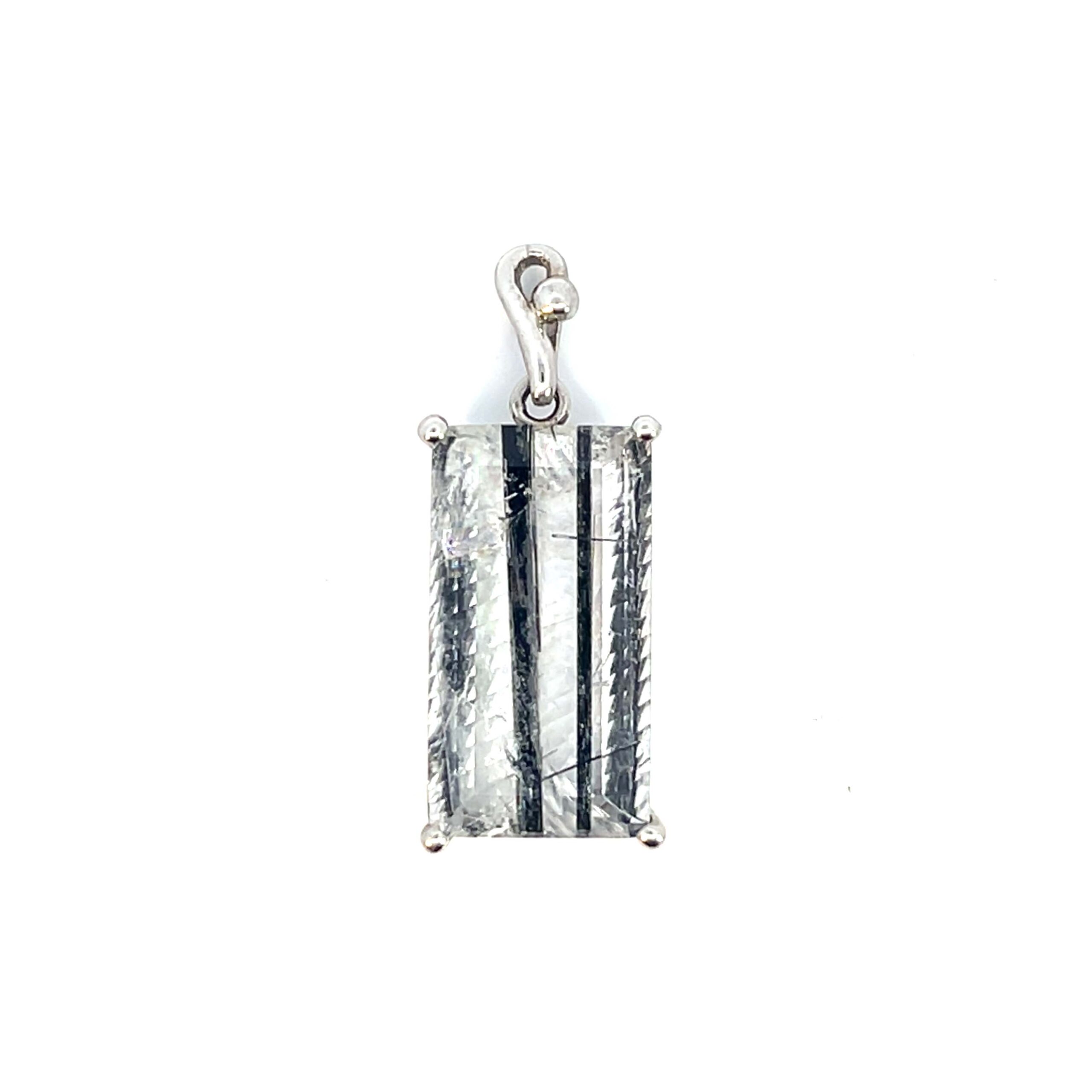 Dieser außergewöhnliche Bergkristall-Anhänger begeistert durch seine klaren Strukturen und die deutlich sichtbaren Turmalinkristalleinschlüsse (Schörl). Die tiefschwarzen, nadelförmigen Turmaline wirken im transparenten Bergkristall wie schwebende Linien und bilden ein faszinierendes, natürliches Kunstwerk. Gefasst ist der Stein in hochwertiges 925er Silber, das sorgfältig verarbeitet wurde, um die Klarheit und Schönheit des Minerals optimal zu präsentieren.