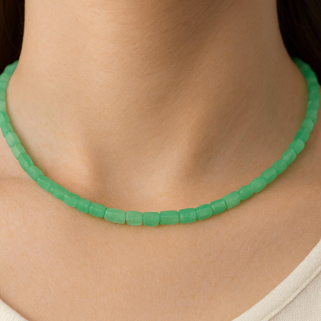Seit Jahrhunderten gilt der Chrysopras als „Stein der Hoffnung“ und wird mit Vertrauen, innerer Ruhe und neuer Lebenskraft verbunden. Seine intensive grüne Farbe symbolisiert Frische, Harmonie und Wachstum – Eigenschaften, die diese Halskette nicht nur äußerlich zu einem Blickfang machen, sondern auch auf symbolischer Ebene eine besondere Bedeutung verleihen.