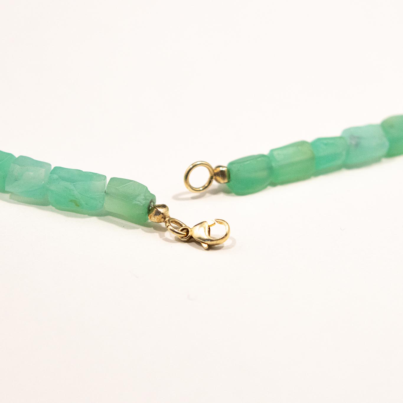 Die handbehauene Chrysopras Halskette mit silber-vergoldetem Verschluss ist weit mehr als ein schönes Accessoire – sie ist Ausdruck echter Handwerkskunst, eine Hommage an die Natur und ein Symbol für zeitlose Eleganz.