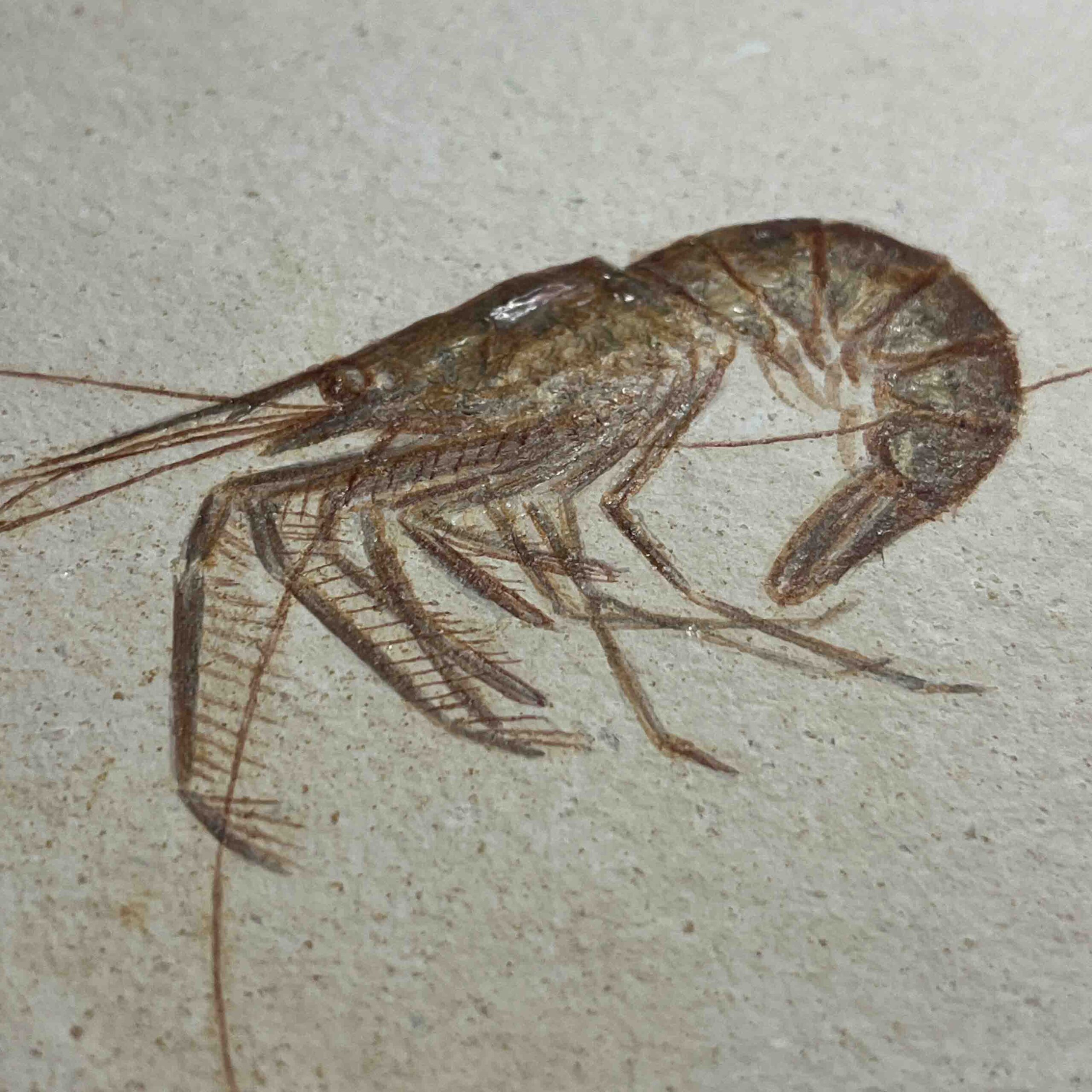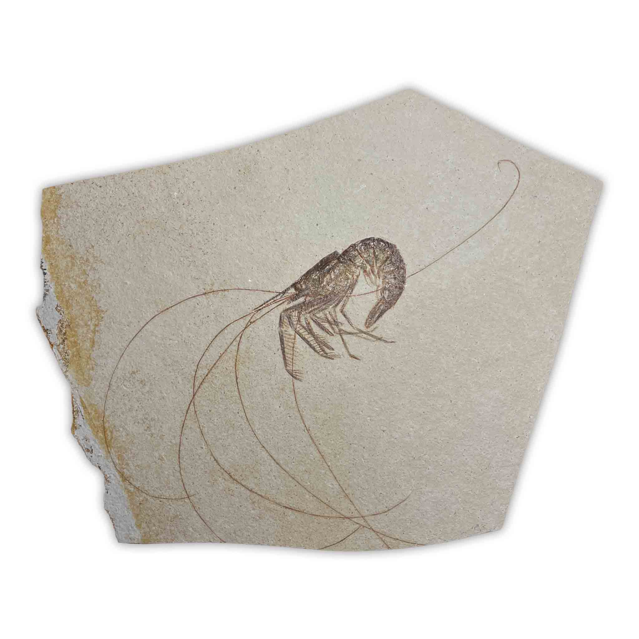 Der fossile Antrimpos war ein urzeitlicher Krebs, der in den warmen, flachen Lagunen lebte, die damals das heutige Bayern bedeckten. Seine feingliedrigen Scheren, der segmentierte Panzer und die charakteristische Körperform lassen sich bei gut erhaltenen Exemplaren wunderbar erkennen. Oft sind sogar feine Strukturen wie Fühler oder Beinansätze sichtbar – ein faszinierender Einblick in die Evolution der Krebstiere.