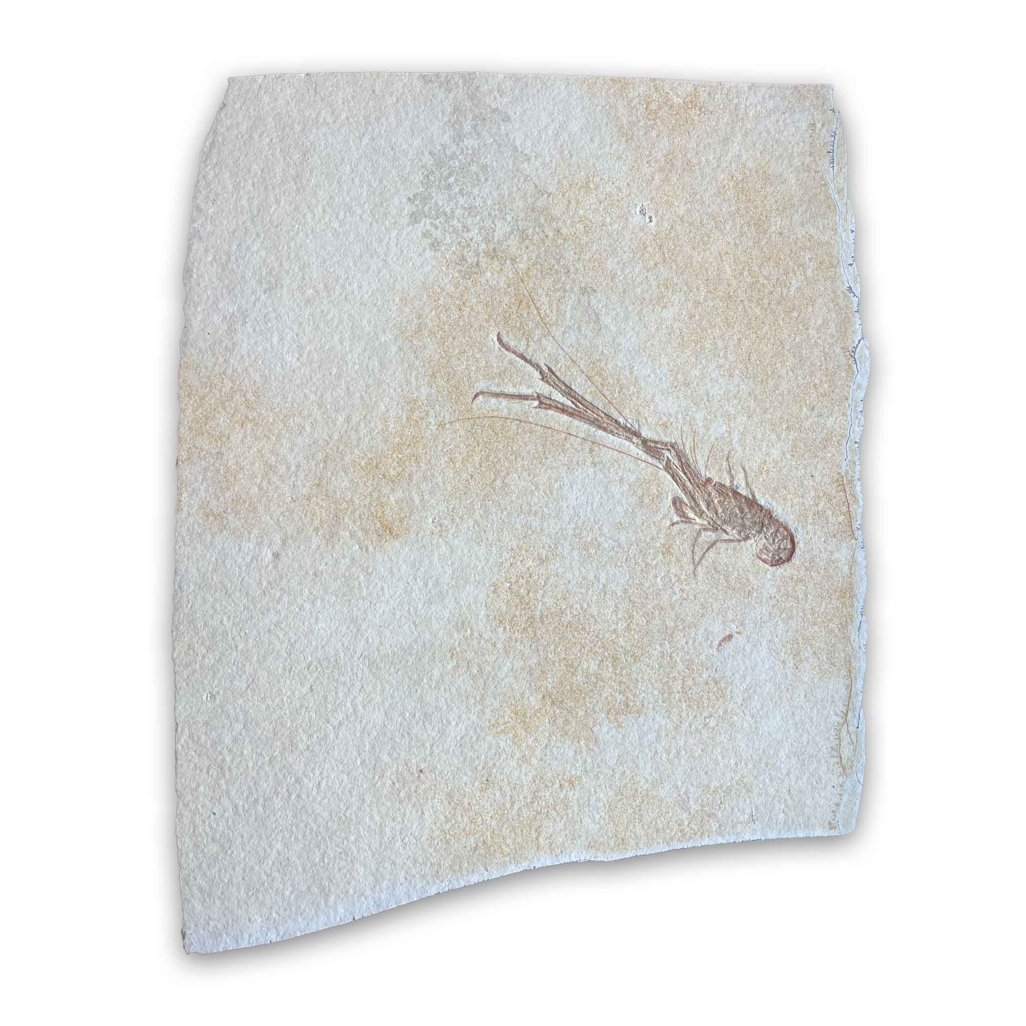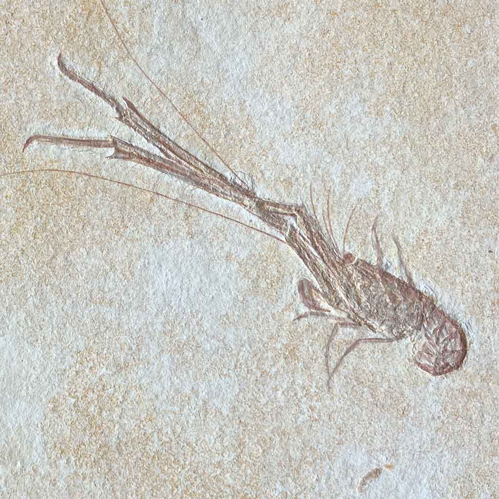 Aeger gehört zu den urzeitlichen Zehnfußkrebsen, die in den flachen, warmen Lagunen des Jurameeres lebten. Typisch sind der schlanke, gegliederte Körper, die deutlich ausgeprägten Scherenarme sowie die feinen Bein- und Antennenstrukturen. Bei diesem Exemplar lassen sich diese Merkmale sehr gut nachvollziehen, was auf eine qualitativ hochwertige Erhaltung hinweist.