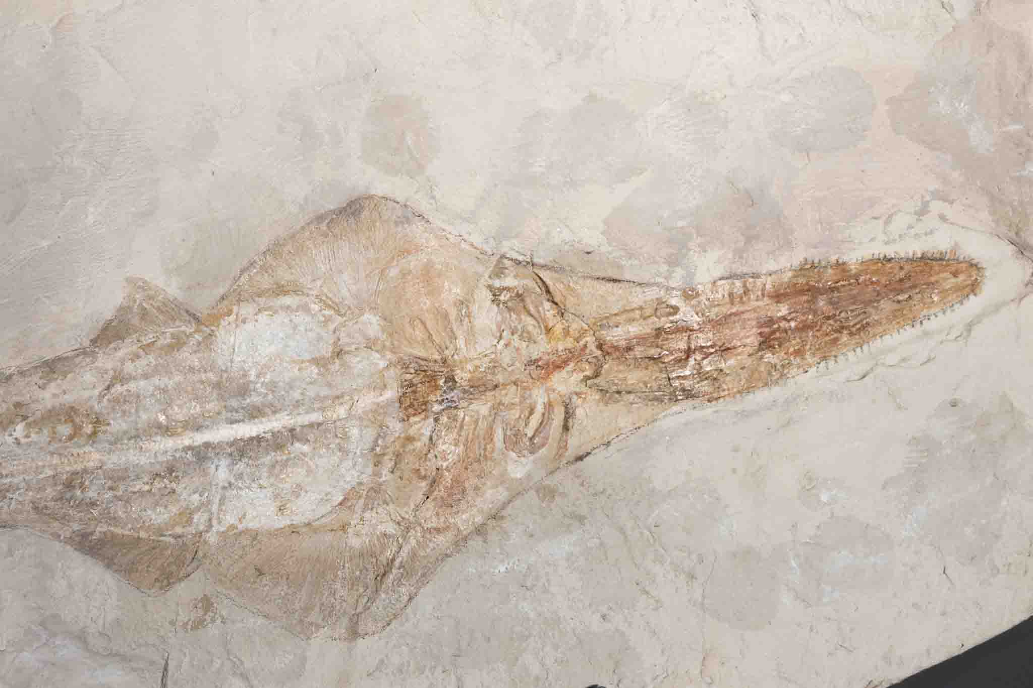 Dieses außergewöhnliche Fossilensemble zeigt eine faszinierende marine Lebensgemeinschaft der Kreidezeit und stammt aus den weltberühmten Fossillagerstätten von Hagula im Libanon. Mit einem Alter von etwa 90 Millionen Jahren dokumentiert dieses Stück eindrucksvoll die Vielfalt und Komplexität der damaligen Meeresökosysteme. Erhalten sind mehrere unterschiedliche Tiergruppen: ein Rochen der Gattung Rhinobatos sp., ein Sägefisch Libanopristis hiram, fossile Shrimps (Carpopenacus) sowie ein Fisch der Gattung Nematonodus.