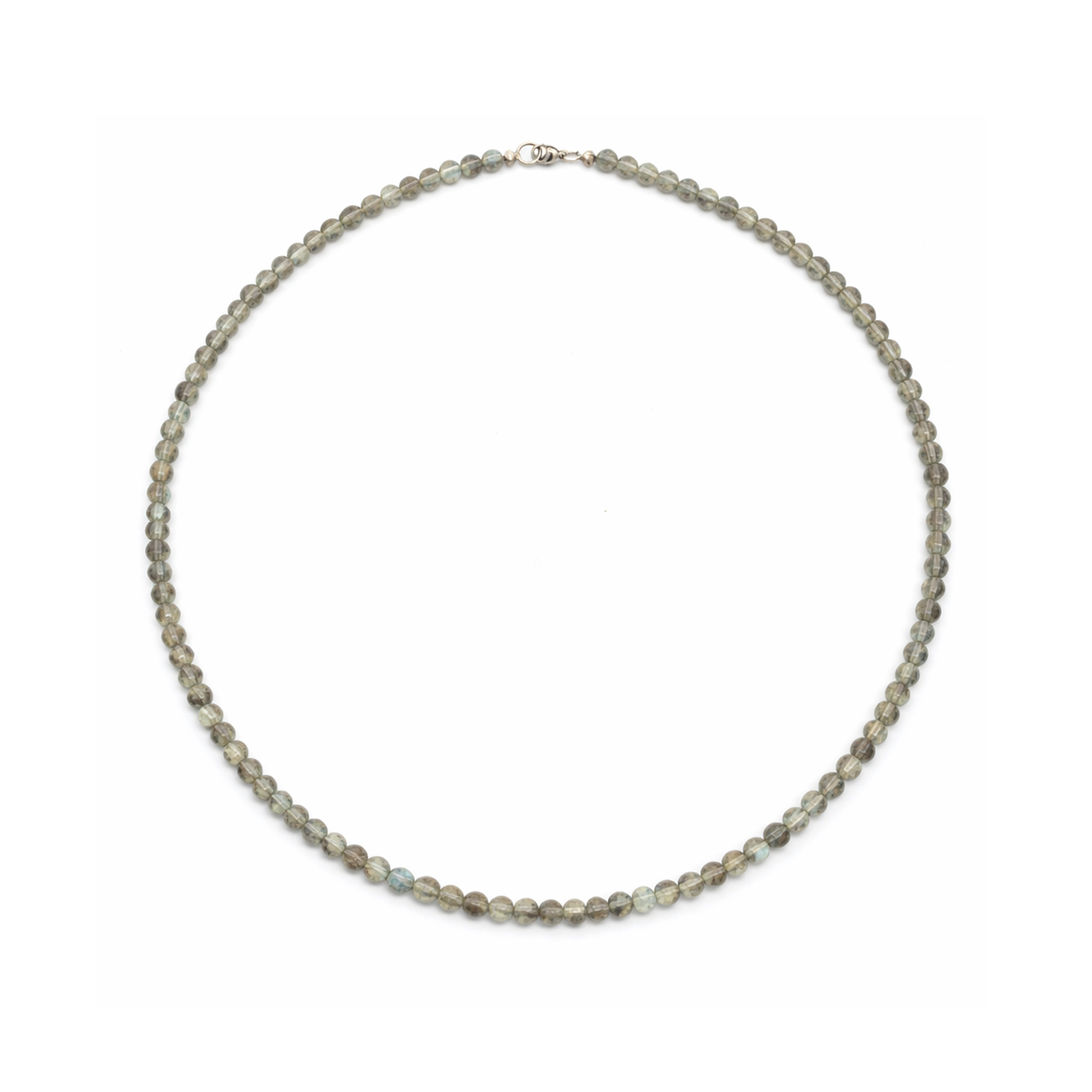Die Labradorit Halskette besteht aus ca. 4 mm großen Perlen, die eine filigrane und dezente Wirkung erzeugen. Der Sterlingsilber-Verschluss sorgt für sicheren Halt und rundet das hochwertige Design ab.